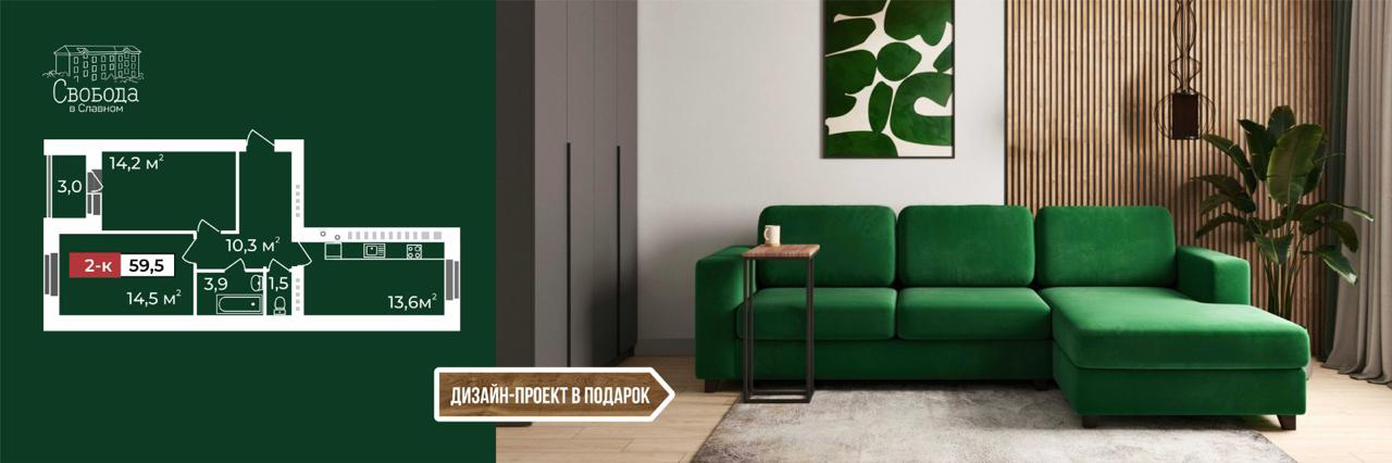 В ЖК «Свобода в Славном» — при покупке 2-комн. кв 59,5 м² до 30.10.2025 дизайн-проект в подарок на выбор: