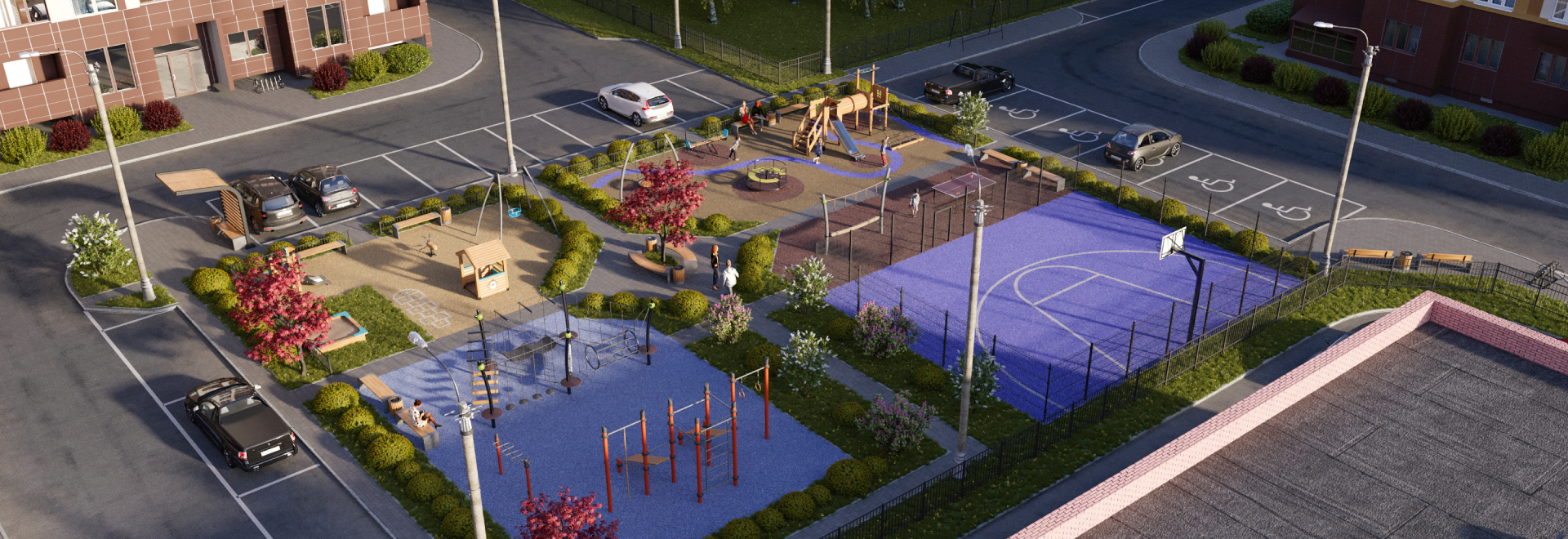 Территория комплекса — это продуманное пространство для всей семьи, где каждый найдёт своё место: от малыша до подростка, от любителя йоги до активного спортсмена.