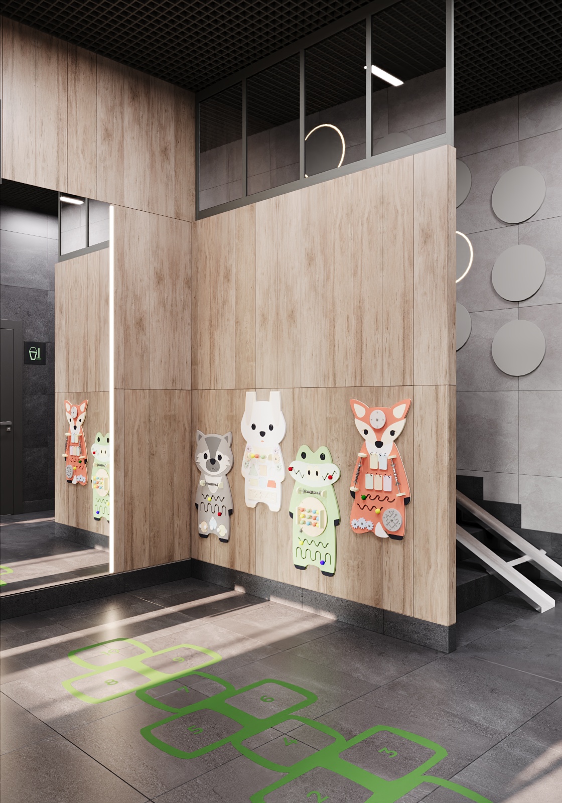 В подъездах — цветные ростомеры с забавными героями (вот он, ваш малыш, уже на 10 см выше!), а рядом — бизиборды с вращающимися шестерёнками и магнитными пазлами. Теперь даже ожидание лифта превратится в игру!