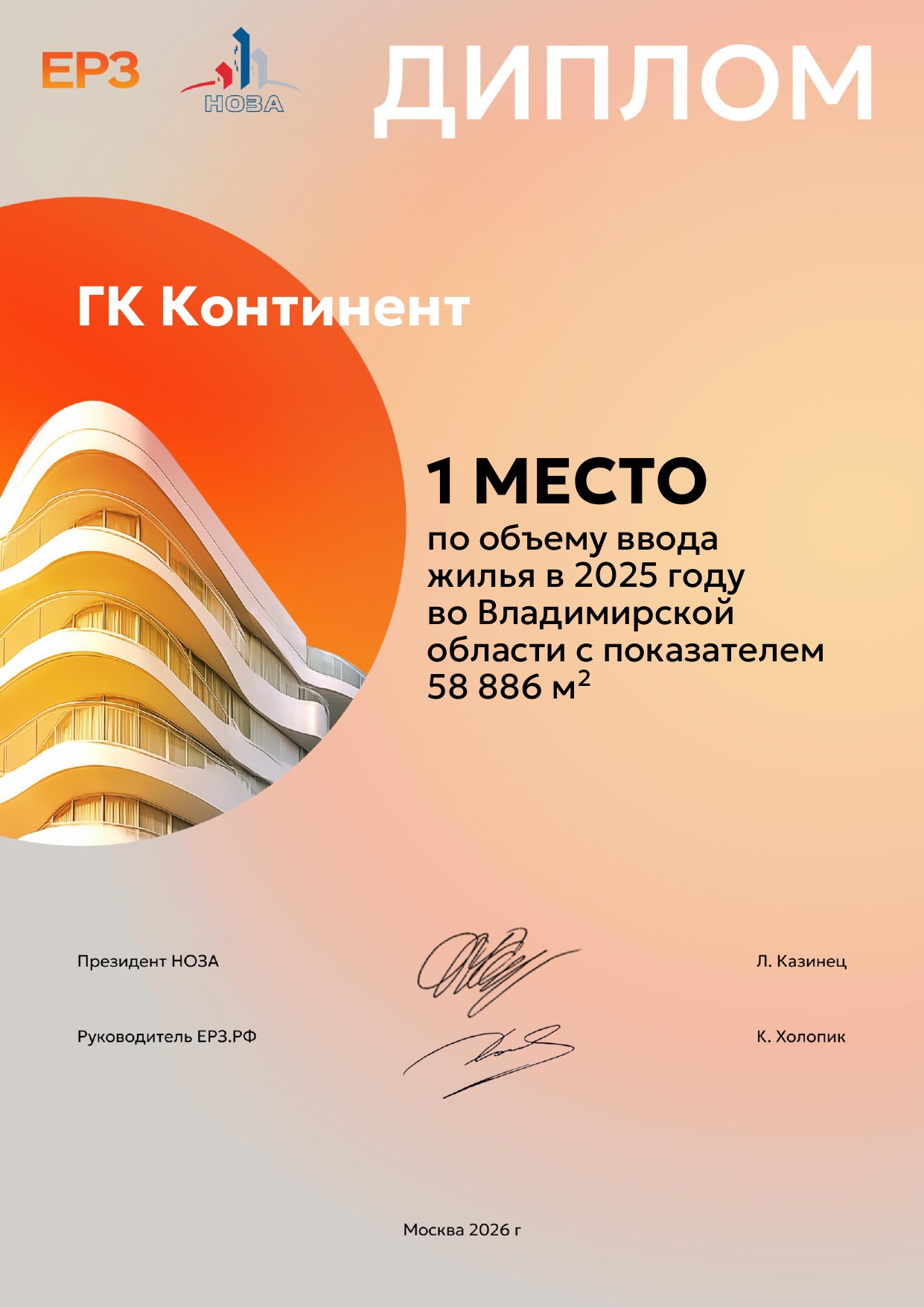 Мы заняла первое место по объёму ввода жилья в 2025 году во Владимирской области. Диплом вручён аналитическим порталом ЕРЗ.РФ — ведущей отраслевой платформой, формирующей рейтинги на основе данных ЕИСЖС.